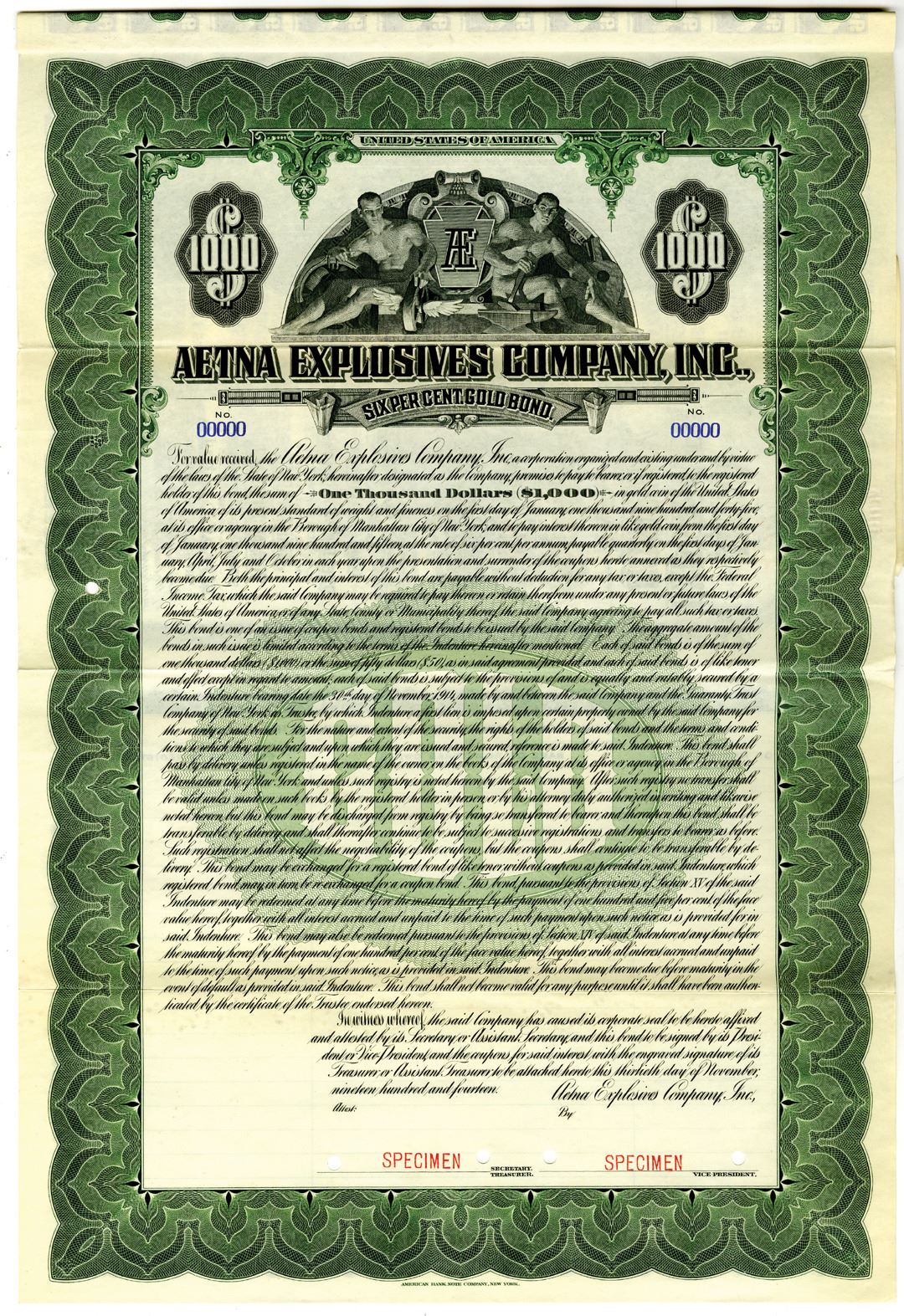 New York, 1914. $1000 Specimen 6% Gold Coupon Bond, Black text with green border and undertint, Aetna logo at top center flanked by allegorical men. Red specimen overprints, 00000 serial numbers, and POCs. VF condition, ABNC. On April 3, 1880, three men from Chicago incorporated the Aetna Powder Company in Indiana to make high explosive powder, the newly invented dynamite. James Parker and Horace Pratt, coal salesmen, and Michael Tierney, a politician had little idea of how to build or run a dynamite factory. In November of 1914, an ex-director of the du Pont company, A.J. Moxham realized his plan to consolidate into one company the principal competitors of the du Pont by incorporating the Aetna Explosives Company in New York. This bond specimen is an example of the bonds issued for the consolidation of the different powder companies. Rare with only 3 examples found in the ABN Archives.