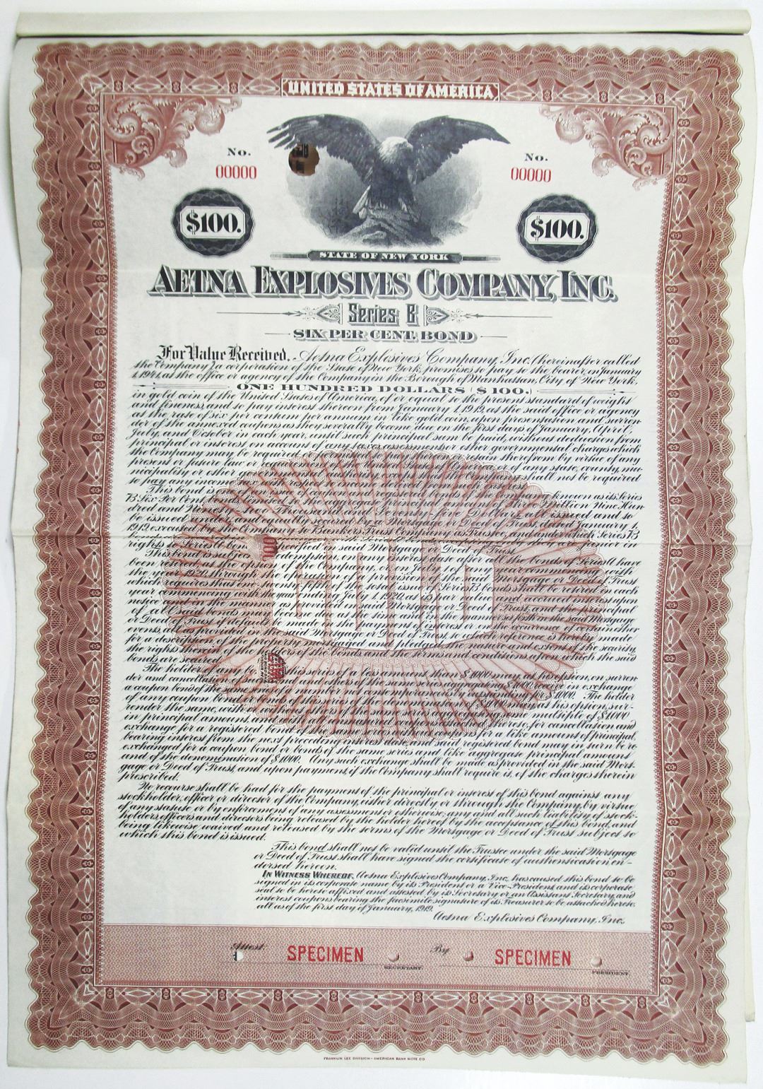 New York, 1919. $100 Specimen 6% Coupon Bond, Black text with brown border and undertint, Eagle at top center with spread wings. Red specimen overprints, 00000 serial numbers, and POCs. VF condition, ABNC. On January 1, 1919 Bankers Trust Company of New York became trustee of the company and the finances of the company were reorganized. Aetna Explosives tried to hang on, publishing a 156 page book/catalog describing its products and how to use them in 1920. The cover of that book listed thirteen branch offices, nine large plants, and one-hundred and ten distributing stations, but it was all for naught, for in 1921 Aetna Explosives was sold to the Hercules Powder Company, one of the companies formed after the breakup of the Powder Trust. Rare Transition bond issued for the takeover by Bankers Trust Company in 1919.