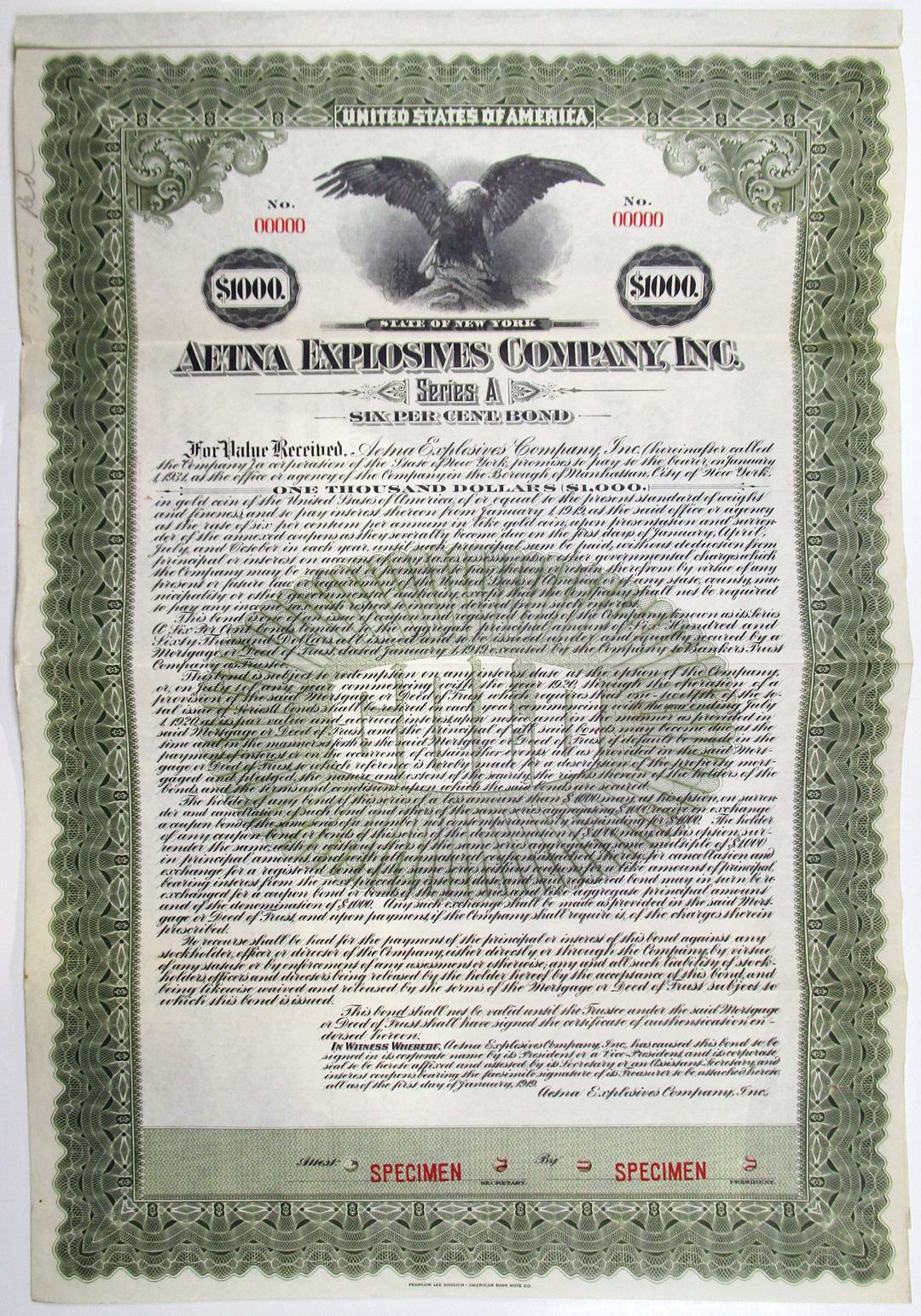 New York, 1919. $1000 Specimen 6% Series A Coupon Bond, Black text with green border and undertint, Eagle with spread wings at top center. Red specimen overprints, 00000 serial numbers, and POCs. Fine-VF condition, ABNC. On January 1, 1919 Bankers Trust Company of New York became trustee of the company and the finances of the company were reorganized. Aetna Explosives tried to hang on, publishing a 156 page book/catalog describing its products and how to use them in 1920. The cover of that book listed thirteen branch offices, nine large plants, and one-hundred and ten distributing stations, but it was all for naught, for in 1921 Aetna Explosives was sold to the Hercules Powder Company, one of the companies formed after the breakup of the Powder Trust. Rare Transition bond issued for the takeover by Bankers Trust Company in 1919.