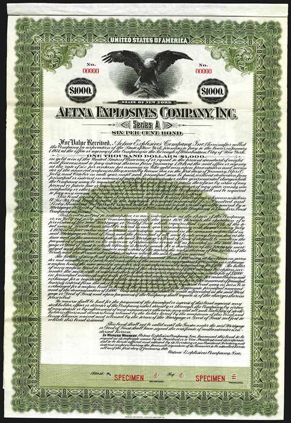New York. 1919. $50, 6% Series B bond. Blue border and underprint w/ eagle vignette. Specimen, POC's, XF. FLD-ABNC. Scarce gunpowder and dynamite bond.