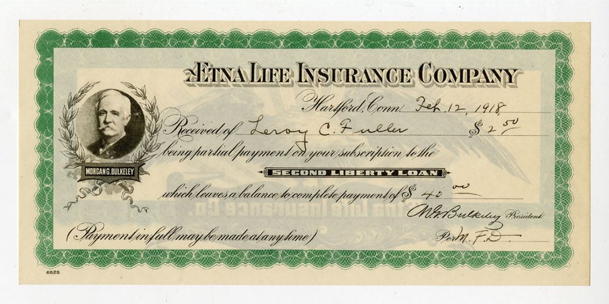 Hartford, Connecticut, 1918. $2.50, I/U receipt for partial payment on a Second Liberty Loan, Black printing on green border with portrait of Morgan G. Bulkeley at left, Uncirculated condition.