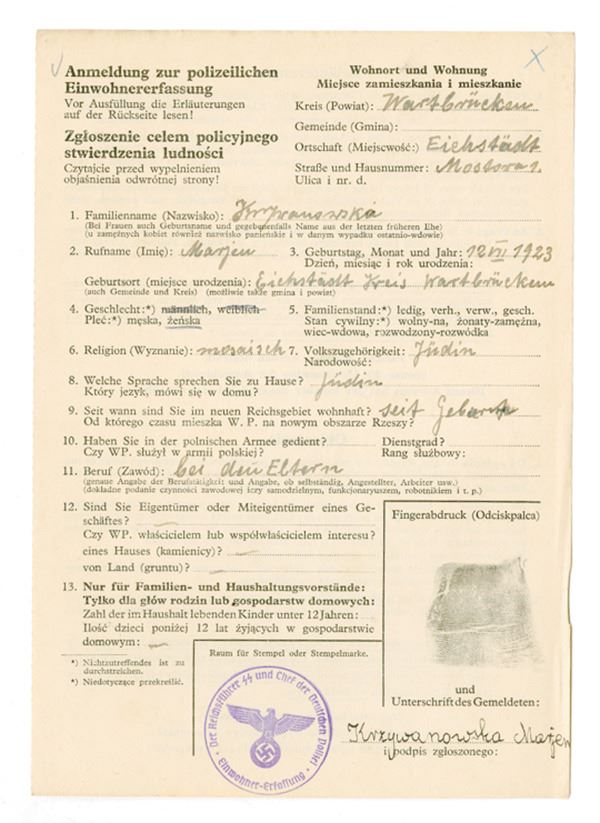 Germany, Nazi application for "Police Inquiry" printed in German and Polish for Marjen Krxywnowska. The certificate was required to be filled out by Jews. Marjen says that she is Jewish and that her family spoke Hebrew at home. At the bottom we can see her fingerprint and a Nazi stamp at bottom.