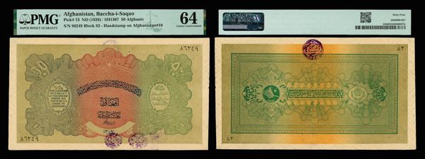 Afghanistan, Baccha-i-Saqao, PMG graded Choice Uncirculated 64, SH1307 (1928) (Pick-13),