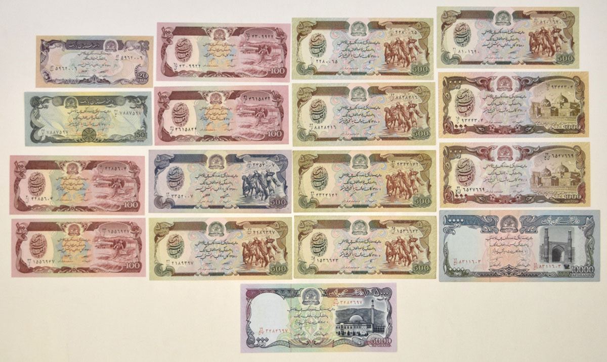 Afghanistan, 1979-91. Lot of 17 Issued Banknotes, Includes: 1979, 20 Afghanis, P-56a; 1991, 50 Afghanis, P-57b; 1979-91, 100 Afghanis, P-58 (4); 1979, 500 Afghanis, P-59; 1979-91, 500 Afghanis, P-60 (6); 1991, 1000 Afghanis, P-61c (2); 1993, 5000 Afghanis, P-62; 1993, 10,000 Afghanis, P-63a. Notes range from VF to UNC condition. (17). Sold "AS IS" no returns accepted.
