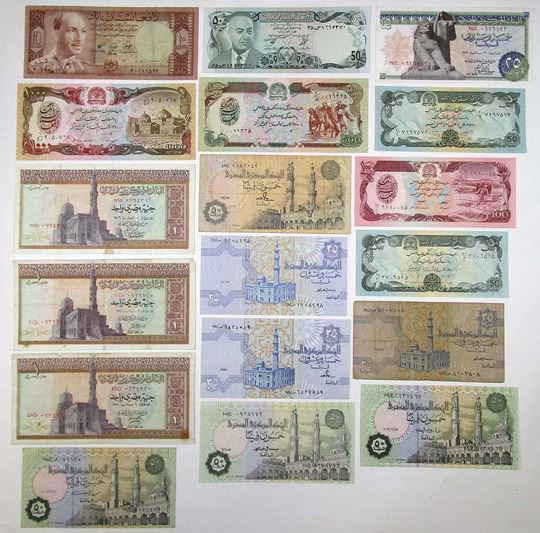 Afghanistan....., Ethiopia, Egypt, Tunisia, & Eritrea, 1961-1995. Lot of 34 Issued Banknotes, 1 Note from Post Rebellion Bank of Afghanistan; 1 Note from Bank of Afghanistan; 6 Banknotes from Da Afghanistan Bank; 2 Banknotes from National Bank of Ethiopia; 18 Banknotes from Central Bank of Egypt; 3 Banknotes from the Arab Republic of Egypt; 1 Banknote from Central Bank of Tunisia; 3 Banknotes from Bank of Eritrea. (34). Sold "AS IS" no returns accepted.