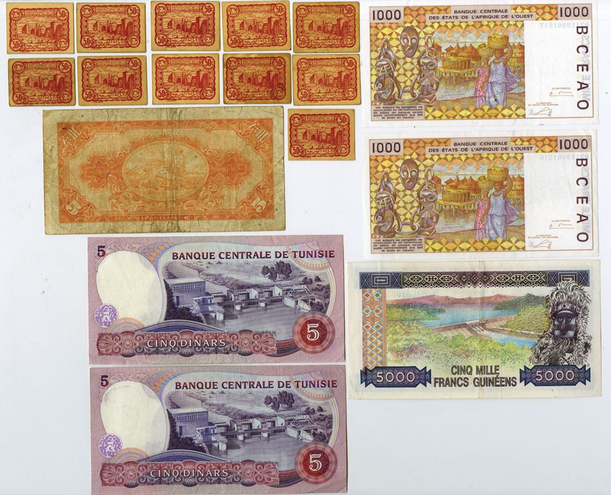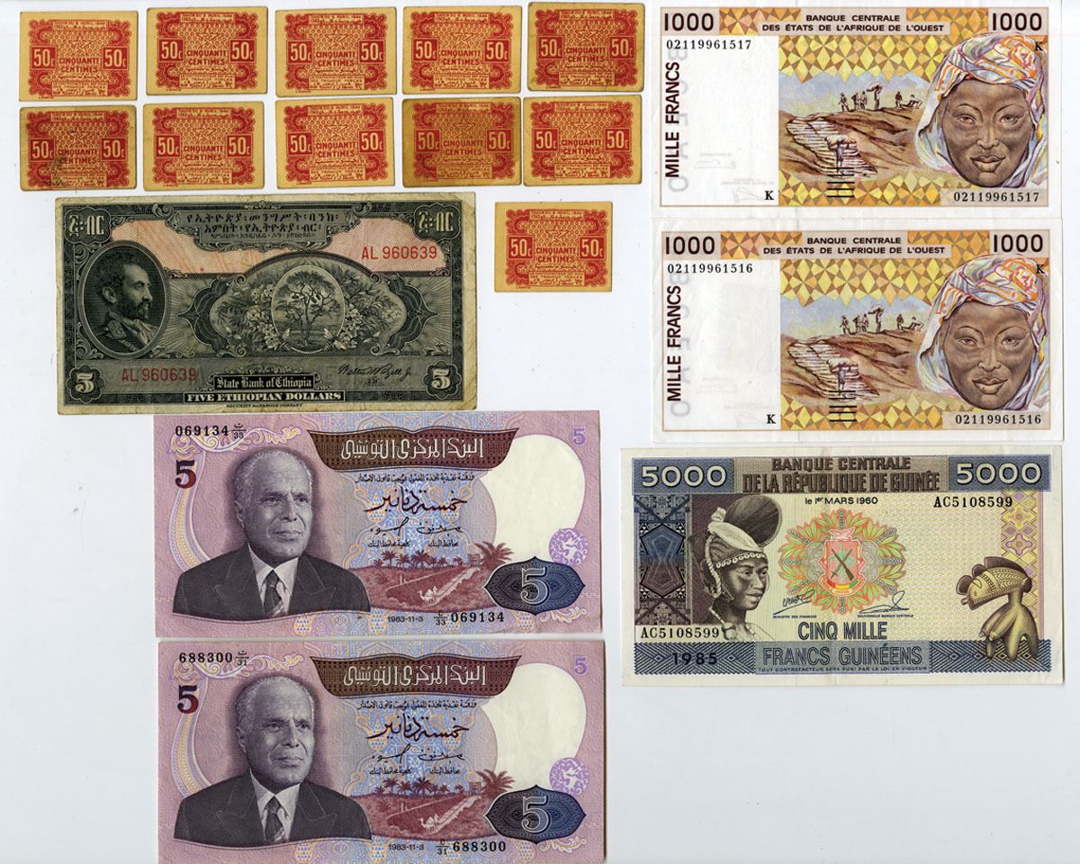 Africa..., 1944 to 2002. Lot of 17 Issued Banknotes, Includes: ND (1945), State Bank of Ethiopia 5 Dollars, P-13c, SBNC; 1985, Central Bank of the Republic of Guinea 5000 Francs, P-33a; 1944, Cherifien Empire (Morocco) Protectorate of the French Republic 50 Centimes, P-41 (11); 1983, Central Bank of Tunisia 5 Dinars, P-79 (2); 2002, West African States (Senegal) 1000 Francs, P-711Kl (2). Notes range from Fine to XF condition. (17). Sold "AS IS" no returns accepted.
