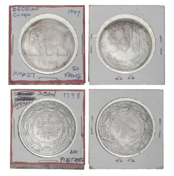 Various Rulers this extensive lot consists of 92 coins from Algeria, Angola, Azores, Belgian Congo, Botswana, British West Africa, Burundi, Cameroon, French Somaliland, French West Africa, Gambia, Ghana, Guinea, Italian Somaliland, Ivory Coast, Katanga, Kenya, Lesotho, Liberia, Madagascar, Malawi, Mali, Mauritius, Mombasa, Mozambique, Niger, Rhodesia & Nyasaland, Rwanda, Rwanda & Burundi, Sierra Leone, South Africa, Sudan (Omdurman), Tanzania, Tunisia, Uganda, and Zanzibar. Highlights include Zanzibar's 1 Pysa (1882, KM-1), Sierra Leone's proof coins (1964, KM-16 to KM-21), Angola's 20 Escudos (1952, KM-74), Azores' 10 Reis (1901, KM-17), Burundi's 500 Francs (1966, X#Â M10), Botswana's 50 Cents (1966, KM-1), Cameroon's 50 Francs (1960, KM-13), Rwanda & Burundi's 1 Franc (1961, KM-1), Belgian Congo's 50 Francs (1944, KM-27), French West Africa's 25 Francs (1956-1957, KM-7, KM-9), Gambia's 4 Shillings (1966, KM-6), Ghana's 10 Shillings (1958, KM-7), Guinea's coins (1962-1969, KM-7, KM-12, KM-13, KM-16), Italian Somaliland's 1 Somalo (1950, KM-5), Kenya's 2 and 5 Shillings (1966, 1985, KM-6, KM-23), Lesotho's 50 Licente (1966, KM-4.2), Liberia's 1 Dollar (1961-1962, KM-18), Madagascar's 5 Francs (1953, KM-5), Mali's 10 Francs (1960, KM-1), Malawi's 1 Crown (1966, KM-5), Mauritius' 1 Rupee (1950, KM-29), Mombasa's 1 Pice (1888, KM-1), Mozambique's 20 Escudos (1952, KM-23), Niger's 10 Francs (1965, KM-1), Rhodesia & Nyasaland's Half Crown (1955, KM-7), Southern Rhodesia's 1 Crown (1953, KM-27), Tunisia's 20 Francs (1934, KM-263), and Sudan (Omdurman)'s 20 Qirsh (1892, KM-7). British West Africa's contributions include 1 Shilling (1918, KM-12) and 1 Penny (1936, KM-16), while South Africa's selection spans from 2 Shillings (1896, KM-6) to 5 Shillings (1952, 1960, KM-41, KM-55) and 50 Cents (1964, KM-62). Overall conditions vary from Extremely Fine to Choice Uncirculated, with many Uncirculated pieces (92). Shipping charges apply - weight 2.4 lbs. (photo on web site)