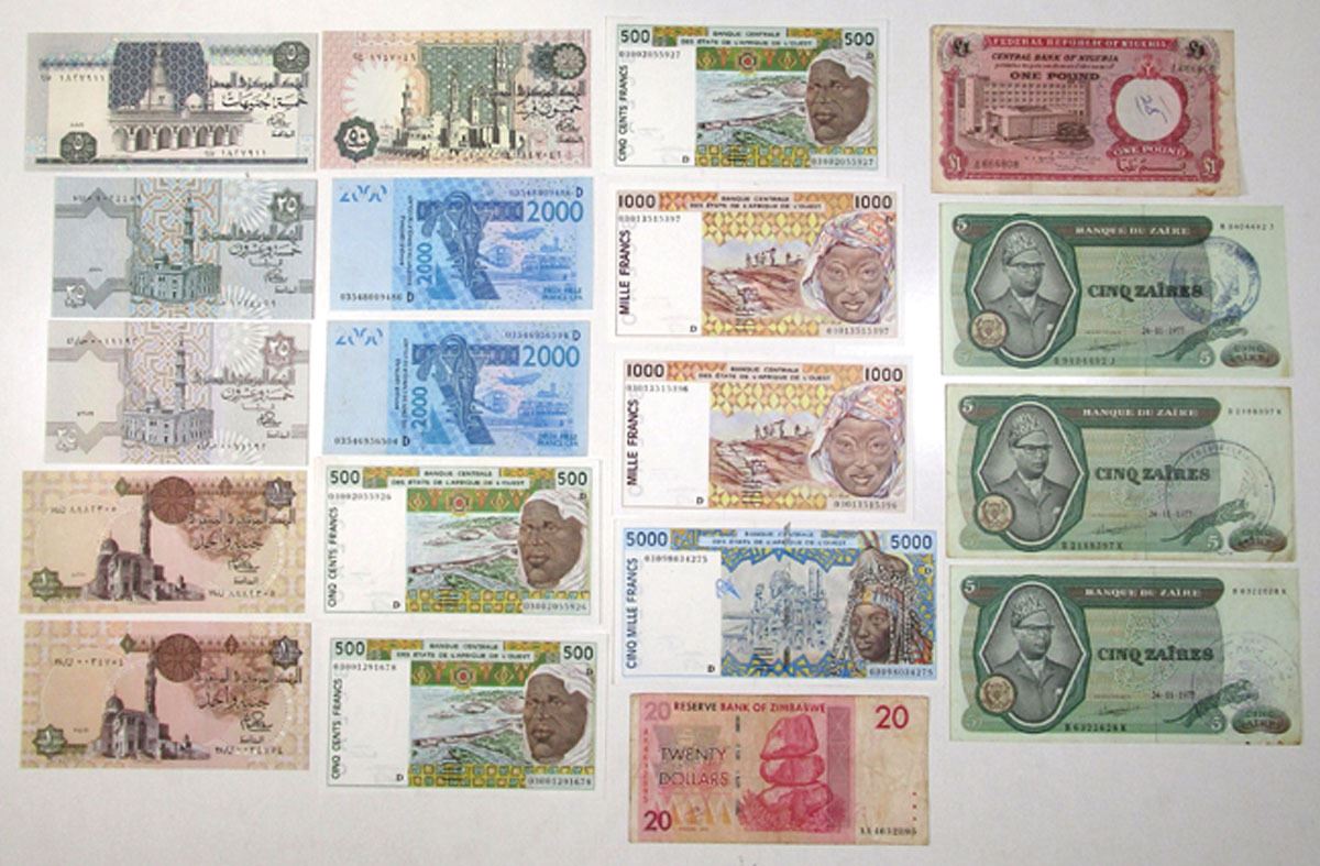 Africa, ND (1967) to 2003. Lot of 19 Issued Banknotes, Includes: Central Bank of West Africa - Mali, 500 Francs, P-410Dm (3), 2002; 1000 Francs, P-411Dm (2), 2002; 5000 Francs, P-413Dm, 2002; 2000 Francs, P-416Db (2), 2003; Reserve Bank of Zimbabwe, 2007 (2008), 20 Dollars, P-68; Central Bank of Nigeria, ND (1967), 1 Pound, P-8; Banque du Zaire, 1977, 5 Zaires, P-21b (3), G& D; Central Bank of Egypt, 1979, 25 Piastres, P-49; 1979 & 2001, 1 Pound, P-50a & P-50f and more. Notes range from VF to Gem UNC condition. (19). Sold "AS IS" no returns accepted.