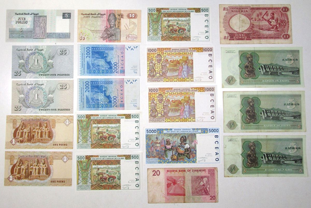 Africa, ND (1967) to 2003. Lot of 19 Issued Banknotes, Includes: Central Bank of West Africa - Mali, 500 Francs, P-410Dm (3), 2002; 1000 Francs, P-411Dm (2), 2002; 5000 Francs, P-413Dm, 2002; 2000 Francs, P-416Db (2), 2003; Reserve Bank of Zimbabwe, 2007 (2008), 20 Dollars, P-68; Central Bank of Nigeria, ND (1967), 1 Pound, P-8; Banque du Zaire, 1977, 5 Zaires, P-21b (3), G& D; Central Bank of Egypt, 1979, 25 Piastres, P-49; 1979 & 2001, 1 Pound, P-50a & P-50f and more. Notes range from VF to Gem UNC condition. (19). Sold "AS IS" no returns accepted.