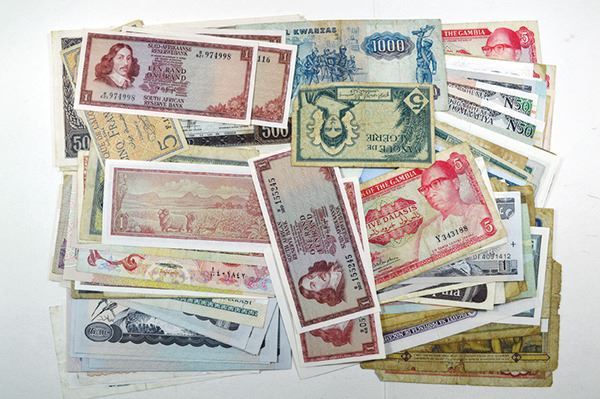 World selections. Includes: Angola, Algeria, Botswana, Burundi, Congo, Ethiopia, Gambia, Ghana, Guinea, Israel, Kenya, Lebanon, Malawi, Morocco, Mocambique, Oman, Qatar, Saudi Arabia, Somalia, South Africa, Syria, Tunisia, Turkey, West African States, Zaire. Fair with stains and paper loss, to Uncirculated. Mostly Very Good. Just over 100 pieces.