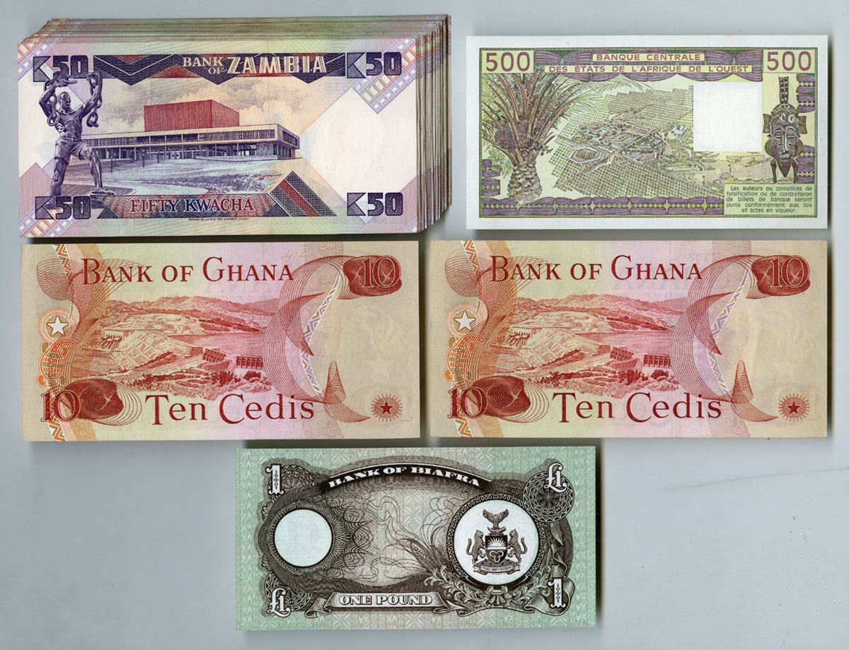 Biafra, Ghana, Togo, & Zambia, ND (1968)-1985. Lot of 99 Issued Banknotes, Includes: Bank of Biafra 1 Pound, P-5a, ND (1968-69), Unc. to CU; Bank of Ghana 10 Cedis, P-16e (2), 1977, Unc. to CU; West African States - Togo 500 Francs, P-806Th, 1985, CU; and, Bank of Zambia, 50 Kwacha, P-28a (95), ND (1986-88), TDLR, mostly Choice XF to AU or Better. (99). Sold "AS IS" no returns accepted.