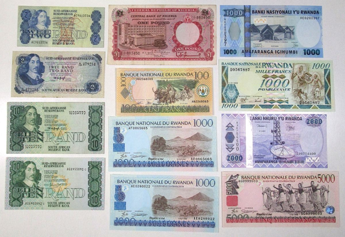 Africa, ND (1967) to 2004. Lot of 12 Issued Banknotes, Includes: ND (1967), Central Bank of Nigeria, 1 Pound, P-8; South African Reserve Bank, ND (1976) 2 Rand, P-117b; ND (1983-1990), 2 Rand, P-118d; ND (1978-1981) 10 Rand, P-120a; ND (1981) 10 Rand, P-120b; National Bank of Rwanda, 1988, 1000 Francs, P-21a; 1998, 1000 Francs, P-27a (2); 1998, 5000 Francs, P-28a; 2003, 100 Francs, P-29a; 2004, 1000 Francs, P-31; 2004, 5000 Francs, P-33. Notes range from VF to UNC condition. (12). Sold "AS IS" no returns accepted.