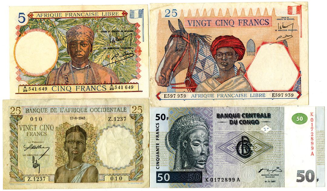 French Equatorial Africa.... Lot of 4 issued banknotes, Includes. 5 Francs, P-6, Green and multicolor; and 25 Francs, P-7a, Red and multicolor; French West Africa: 25 Francs, P-38, Multicolor; and Banque Centrale du Congo, 50 Francs, P-89a, Olive-green, Watermark: Single Okapi head. VF to XF condition. (4)