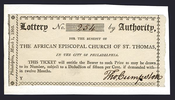 Philadelphia, Pennsylvania. March 1, 1805. Issued lottery ticket #254, Black on light off white bond type of paper mounted on lower border to white thin card that could possibly be removed, Excellent and almost uncirculated condition. The African Episcopal Church of St. Thomas was founded in 1792. The original African Church was an outgrowth of the Free African Society -a mutual aid organization established in 1787 by Absalom Jones, Richard Allen and others -to assist the Black population in Philadelphia. Rare and early African American Lottery ticket. (Stacks Philadelphia Americana Sale, September 2010, Lot #801)