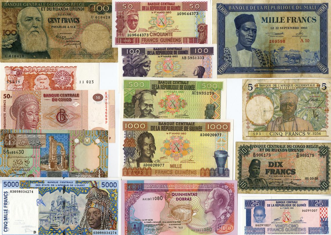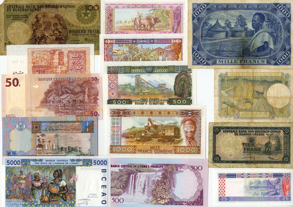 Algeria, Belgian Congo, Congo, French West Africa, Guinea, Libya, Mali, Saint Thomas & Prince, West Africa, 1937-2007. Lot of 14 Issued Banknotes, Includes: Central Bank of Algeria 20 Dinars, P-133a, 1983; Central Bank of Belgian Congo 10 Francs, P-30b, 1958, W& S; 100 Francs, P-33b, 1956, BNB; Central Bank of Congo 50 Francs, P-97a, 2007, G& D; Bank of West Africa 5 Francs, P-21, 1937; Banque Centrale de la Republique de Guinee 25 Francs P-28a, 1960; 50 Francs P-29a, 1960; 100 Francs P-30a, 1960; 500 Francs P-31a, 1960; 1000 Francs P-32a, 1960; Central Bank of Libya 1/4 Dinar, P-62, ND (2002); Banque de la Republique du Mali 1000 Francs, P-4, 1960; Central Bank of Saint Thomas and Prince 500 Dobras, P-63, 1993, TDLR; Central Bank of West Africa 5000 Francs, P-413Dl, 2003. Notes range from Fine to AU condition. (14). Sold "AS IS" no returns accepted.