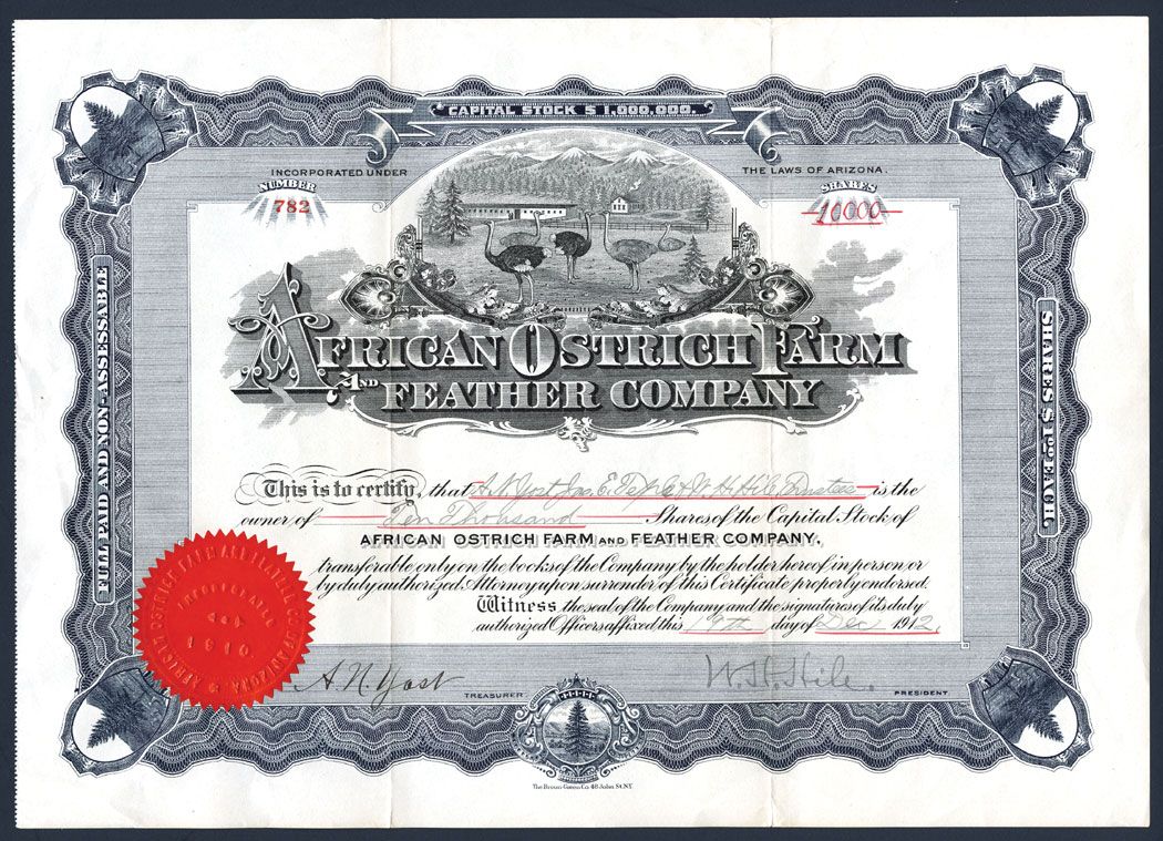 Arizona, 10,000 Shares, I/U, Unique vignette of ostriches walking around with mountains and buildings in back ground. Black and gray, XF condition. Interesting subject matter.