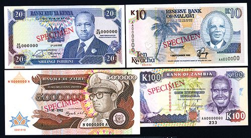 Lot of 4 notes, Includes Central Bank of Kenya, 1992, 20 Shillingi, P-25 s Unpriced as Specimen; Malawi, 1992, Reserve Bank of Malawi, 10 Kwacha, P-25s; Zaire, 1992, Banque Du Zaire, 5,000,000, P-46s; and, Zambia, ND (1991), Bank of Zambia, P-34s. All are in Gem Uncirculated condition. Scarce to rare as specimen. Nice group of African Specimens. TDLR or H&S, printers.