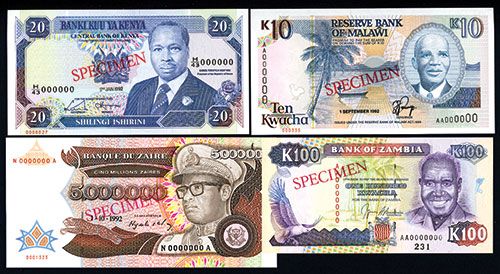 Lot of 4 notes, Includes Central Bank of Kenya, 1992, 20 Shillingi, P-25 s Unpriced as Specimen; Malawi, 1992, Reserve Bank of Malawi, 10 Kwacha, P-25s; Zaire, 1992, Banque Du Zaire, 5,000,000, P-46s; and, Zambia, ND (1991), Bank of Zambia, P-34s. All are in Gem Uncirculated condition. Scarce to rare as specimen. Nice group of African Specimens. TDLR or H&S, printers.