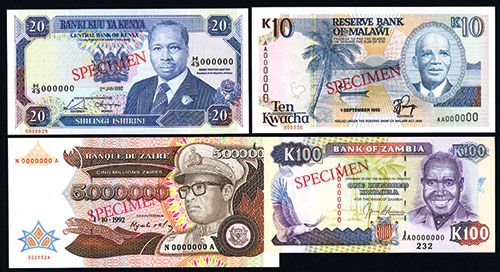 Lot of 4 notes, Includes Central Bank of Kenya, 1992, 20 Shillingi, P-25 s Unpriced as Specimen; Malawi, 1992, Reserve Bank of Malawi, 10 Kwacha, P-25s; Zaire, 1992, Banque Du Zaire, 5,000,000, P-46s; and, Zambia, ND (1991), Bank of Zambia, P-34s. All are in Gem Uncirculated condition. Scarce to rare as specimen. Nice group of African Specimens. TDLR or H&S, printers.