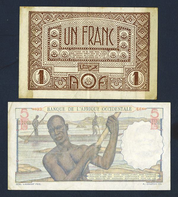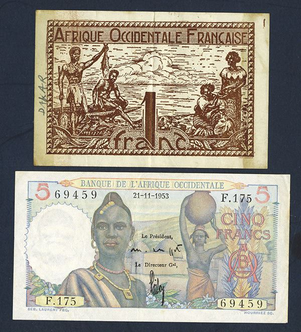 French West Africa. 1 Franc. SCWPM 34b. Fine, edge tone and graffiti DAKAR in margin; 5 Francs. SCWPM 36. 21.11.1953. Fine, some edge tone. 2 pieces.