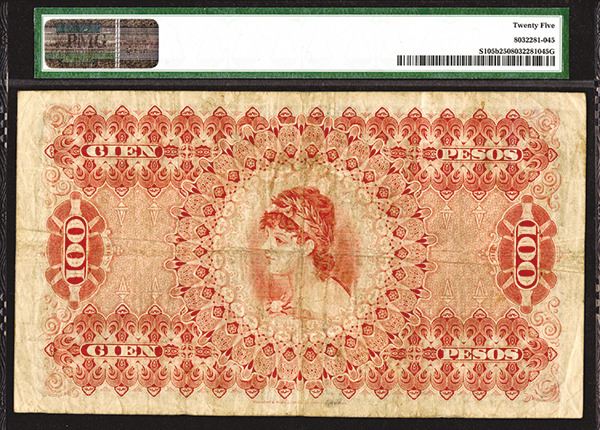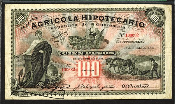 Guatemala, 1st January, 1917, 100 Pesos, P-S105b, Issued banknote, Black on pink and light blue underprint, Standing woman on left, Woman in Chariot in middle and farmer plowing at right, S/N 100682, PMG graded Very Fine 25, Extremely rare in any condition and the finest of 3 graded in the PMG census. Lovely and amazing note missing from all but the most advanced collections. W&S.