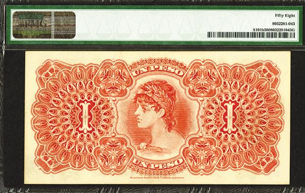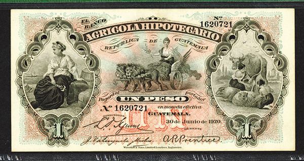 Guatemala, 30th June, 1920, 1 Peso, P-S101b, Issued banknote, Black on pink and light blue underprint, Seated woman on left, Woman in Chariot in middle and women milking cows at right, The first of two sequential banknotes being offered, S/N 1620721, PMG graded Choice About Uncirculated 58, W&S.