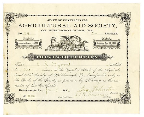 Pennsylvania. 1 Shares Capital Stock Issued Certificate, Black print on black border, State Seal of Pennsylvania at top, Fine-VF condition, Agitator Print.