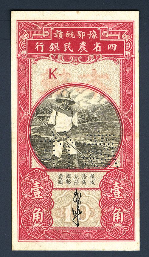 China, 10 Cents, P-A84s, (S/M#S110-1), Issued banknote, Black on red border and m/c underprint on face, Back olive- green, Chinese Specimen overprint on back and pin-punch in middle, S/N “K”, One light corner fold keeps this lovely Choice AU note from CU condition. Printer: TYPC.