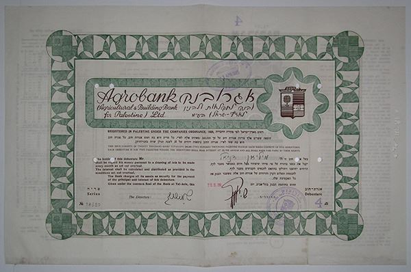 Palestine, 1939. I/C Debenture Bond, Black text with green border, Coat of arms at corners. Cancelled stamps on bond, POCs, Fine condition with some staining near bottom margin.