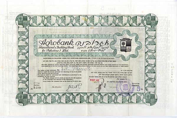 Palestine, 1937. I/U 3% Debenture Bond, Black text with green border. VF condition with some yellow stains on bond near top. Purple stamp at right corner.
