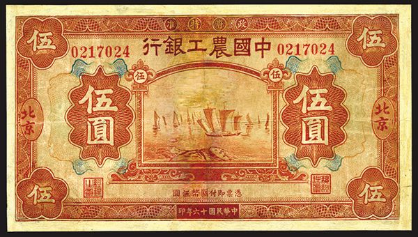 $5, P-A98a (S/M#C287-13), Issued banknote, Red-orange on m/c, Sailing ships at center, PMG graded Very Good 10 NET with note of major repair work, only 2 notes in PG census.