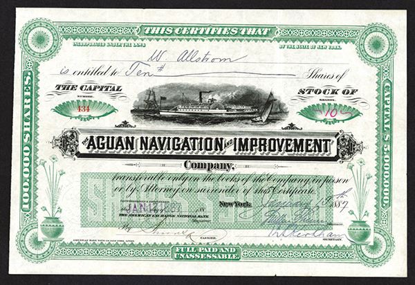Honduras (Inc. in New York). 10 Shrs Stock Certificate, I/U, Black on green border and underprint, Side-wheel steam ship in middle. Very Fine +. ABNC