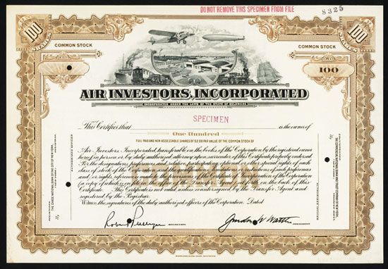 Delaware, ND (ca.1920-40's). 100 Shares, Specimen, Common, Light brown border, Zepplin, Tri-Motor Airplane over airport with locomotive and steamship. POC's. XF condition, HBNC.