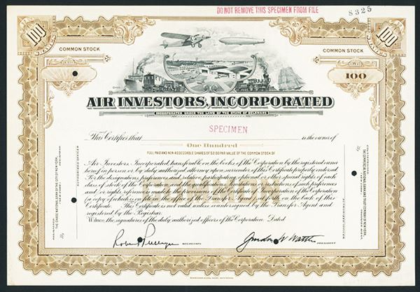 Delaware, ND (ca.1920-40's). 100 Shares, Specimen, Common, Light brown border, Zeppelin, Tri-Motor Airplane over airport with locomotive and steamship. POC's. XF condition, HBNC.