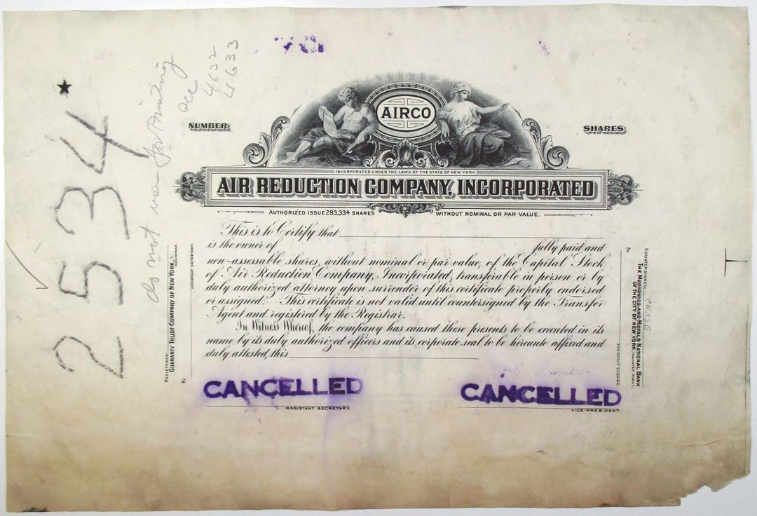 New York, ND (1950-1960s). Odd Shares Progress Proof Capital Stock Certificate, Black text on white paper, Company logo at top flanked by a pair of allegorical figures. Cancelled stamps at bottom, edits made in pencil at left. Fine-VF condition.