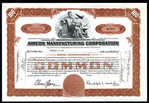 California, 1945, I/U, 100 Shares, #NYC5206, Black on brown border and underprint, Allegorical man sitting with two planes flying near him, VF condition, JBNC.