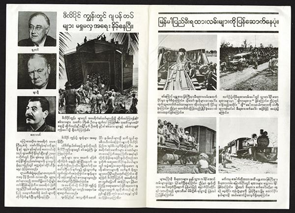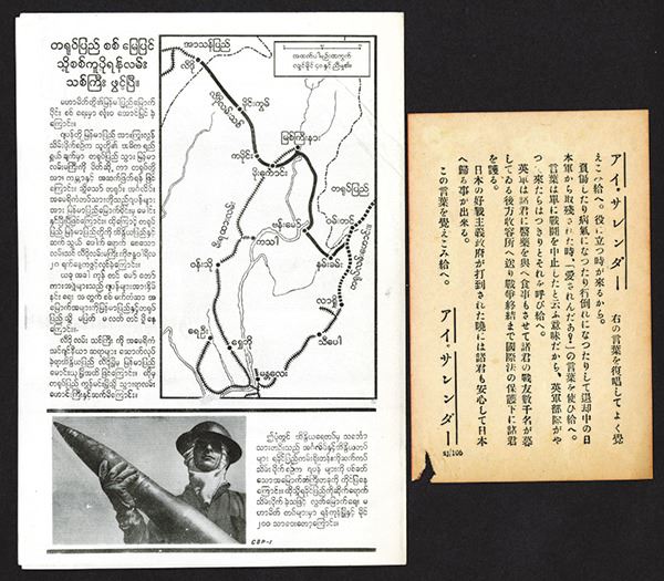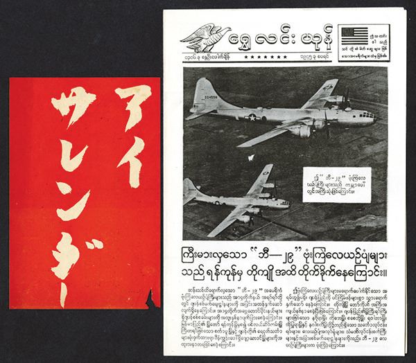Cambodia or Lao WWII era fliers featuring ox cart, planes, trains or burning ships. 5x7 or just a bit smaller. 5 pieces. Nice.