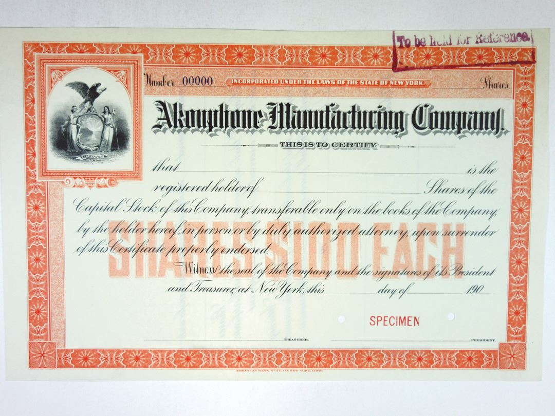 New York, ND (1900s). Odd Shares Specimen Capital Stock Certificate, Black text with orange border and underprint, New York State Coat of Arms at top left corner. Red specimen overprints, Reference stamp at top right corner, 00000 serial number, and POCs. VF condition, ABNC. Miller Reese Hutchison (August 6, 1876 Ð February 16, 1944) was an American electrical engineer and inventor. He developed some of the first portable electric devices, such as a vehicle horn and a hearing aid. Hutchison assembled an electrical hearing aid for one of his friends; it was called the "akouphone" when it was first developed around 1895. Hutchison's interest in the invention stemmed from a childhood friend, Lyman Gould, who was deaf from scarlet fever. Besides his training in engineering, Hutchison had attended classes at the Medical College of Alabama to study the anatomy of the ear. He formed the Akouphone Company in Alabama to market the device, but the original bulky tabletop form was not practical. Rare and early Hearing Aid Company.