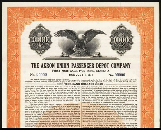 Ohio, 1949, $1000, 4 1/2% 1st Mortgage Specimen Bond Series A, Coupons attached, Black on orange border and underprint, Vignette top center of Bald Eagle perched on a rock, Blue SPECIMEN overprints POC's and blue s/n Ò00000Ó, VF-XF condition, FL-ABNC. Unlisted railroad in Cox.