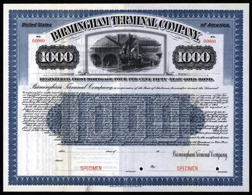 Alabama, 1907, $1000, Horizontal Specimen 4% Gold Bond, Blue border with locomotive vignette, POC's, Coupons attached, XF, ABNC.
