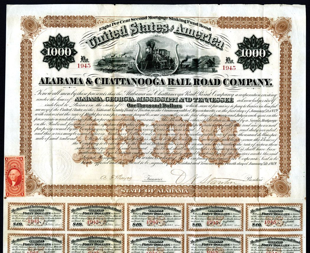 Lot of 10 Bonds. Alabama & Tennessee. 1000, 8% 2nd Mortgage Sinking Fund Bond, Issued and Uncancelled, Coupons attached, Mostly VF to XF condition. All with $1 adhesive 1st Issue revenue stamp. ABNC
