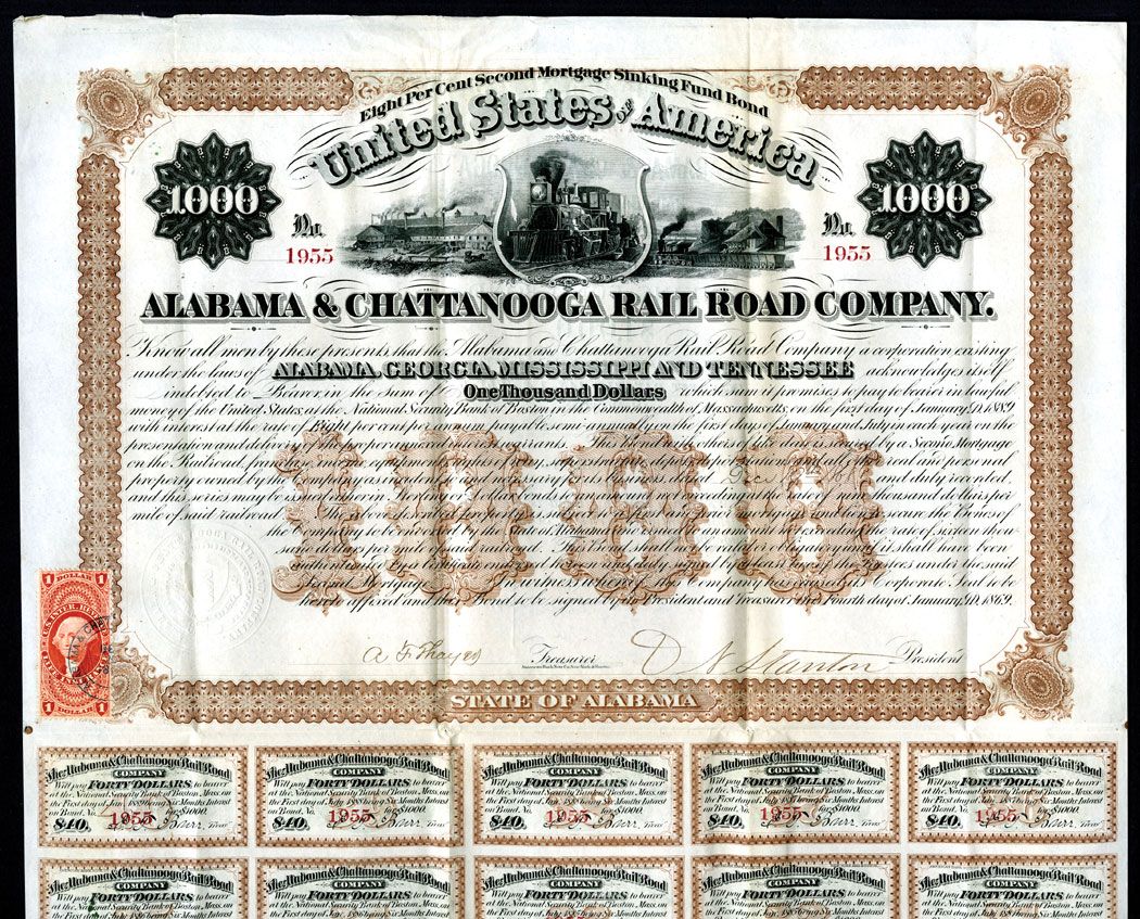 Lot of 10 Bonds. Alabama & Tennessee. 1000, 8% 2nd Mortgage Sinking Fund Bond, Issued and Uncancelled, Coupons attached, Mostly VF to XF condition. All with $1 adhesive 1st Issue revenue stamp. ABNC
