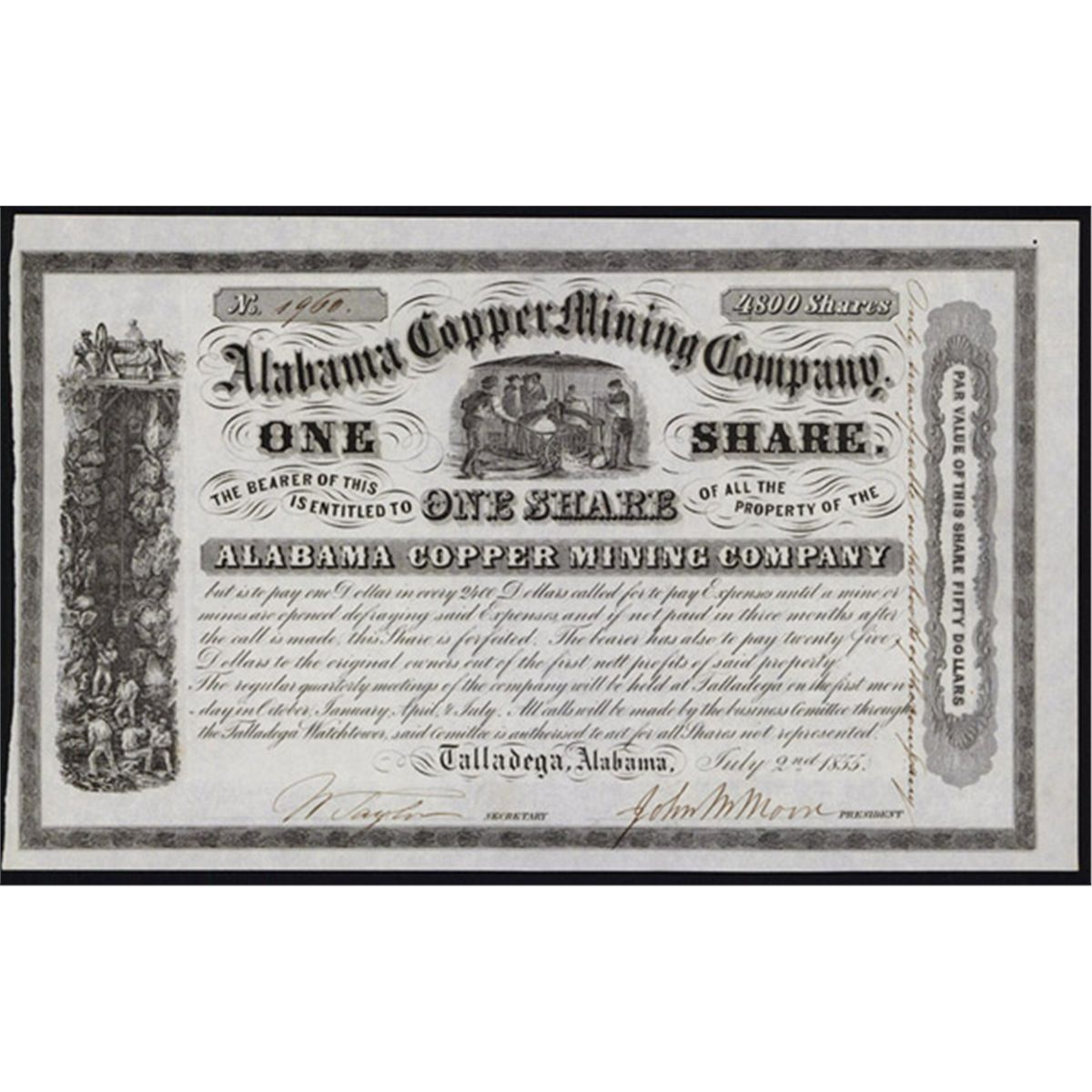 Talladega, Alabama, 1855, 1 Share, issued and uncancelled stock certificate, Copper smelting in center with miners lowering and raising buckets down shaft on left border, ornate title and text, XF condition, Scarce and very attractive Alabama Mining Stock certificate.