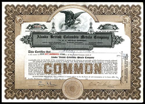 Washington, 1921, 100 Shares, Issued Stock, Black on brown border and underprint, Bald Eagle vignette top center, VF condition.