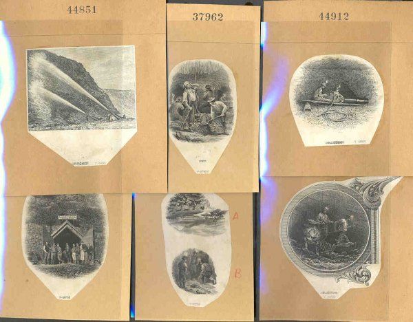 ca.1880-1920's. 12 different proof vignettes, almost all attributed to Western BNC. All are printed on india paper and mounted on manila cards. Includes western mining as well as coal mining. Also includes "Elizabeth Mine" part of the Hubbard-Elliot Copper Mines Development Co. located in Alaska. Vignettes measure between 1 by 1 inch up to 4 by 3 inches. Mostly choice condition. Scarce mining vignette group from well known mid-west printer. WBNC.