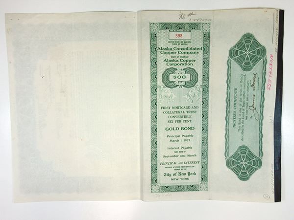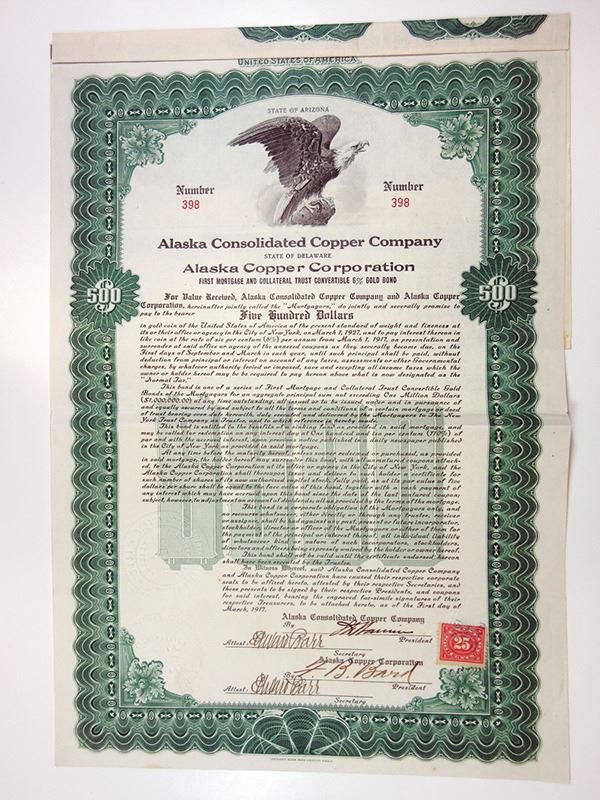 Arizona. $500 Issued and Uncancelled 6% 1st mortgage & Collateral Trust Convertible Gold Coupon Bond, Black print on green border and under tint, Bald Eagle at top, VF-XF condition, SBNC.