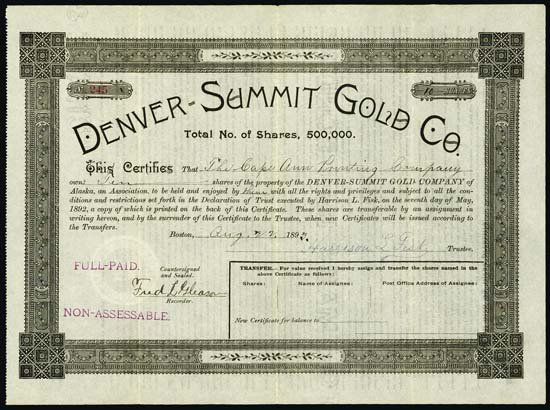 Boston, MA. 1893. 10 Shares. Issued and uncancelled stock. Black border. No vignette. XF condition. Certificate made out to Cape Ann Printing Co. Included with stock is letter from the Denver-Summit Gold Co.on their letterhead dated 1892. Extremely detailed and extensive list of mining properties in Alaska. Properties include "Denver Lode"; Fissure Lode; "Summit Lode"; "Binder Lode", all on Admiralty Island as well as other properties. Rare and early Alaska mining certificate.