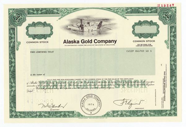 Delaware. Odd Shares Common Stock Specimen Certificate, Black print on green border and under tint, Photograph of large dredge at top, Pin punched cancelled, XF S-C USBNC