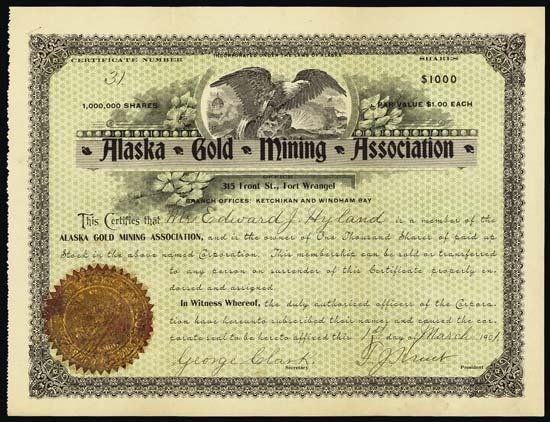 1901. 1000 Shares. Issued and uncancelled stock. Black border with light green undertint. Eagle vignette. Certificate #31. XF condition. Incorporated Alaska. Rare and early certificate.