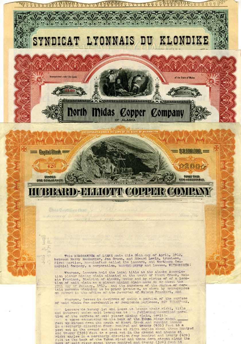 Alaska, Washington, France, 1901-17. Lot of 4, Includes: Alaska and France. Syndicate Lyonnais du Klondike 1901, 1 Share I/U Certificate; Hubbard-Elliott Copper Co. 1911, 200 Shares Capital Stock I/U Certificate; North Midas Copper Co. of Alaska 1917, 10,050 Shares Capital Stock I/U Certificate; Alaska Placer Mining Claim Contract, 1912, Claim for land in Nulato Precinct, Alaska, with claim commencing at the Yukon River and would be held for twenty years. Prepared but not signed or endorsed. The agreement was between Harry Hamburger, Joe Green and Edward Lewin (The Lessors) and the Northern Commercial Company (Lessee), which was a company that operated retail stores in Alaska during the early period of Alaska's ownership by the United States. From 1901 to 1992, it was known as the Northern Commercial Company (NCC). In 1992, it resumed business as the Alaska Commercial Company under the ownership of The North West Company. Rare early Alaska Mining related documents. Documents range from Fine-VF+ condition. (4). Sold "AS IS" no returns accepted.